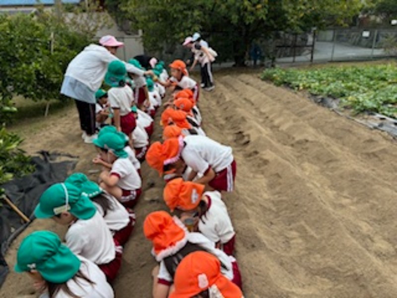 それぞれ畝に指で3つの穴をあけ、そこに種を置いて、土をかぶせました。